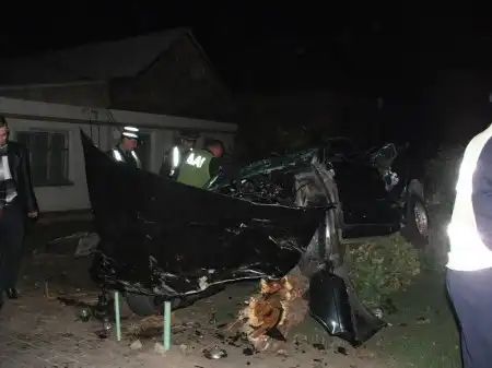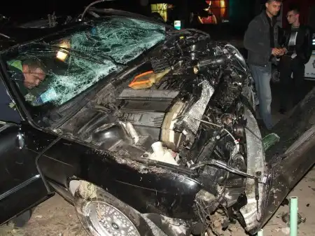 На скорости около 120 км машина начала рыскать и вылетела с дороги, снесла здоровенный тополь и развернувшись в воздухе снесла столб. крышей