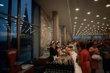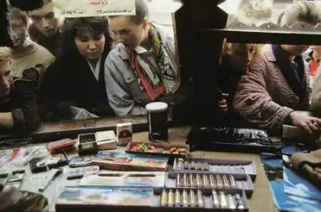 Не секрет, что в Советском союзе товары выдавали, только на складах и в коммерческих магазинах, так же по праву принадлежавших государству. На фото, мы наблюдаем, вид из окна коммерческого киоска, у которого скопилась большая очередь.