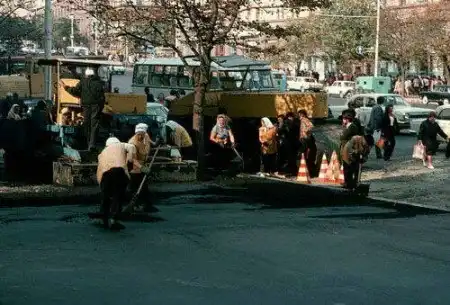 Женщины асфальтируют проезжую часть, странно не правда-ли? Однако, в СССР запрещали эксплуатацию дешёвой рабочей силы, а так же допускали к работе не зарегистрированных в Союзе лиц.