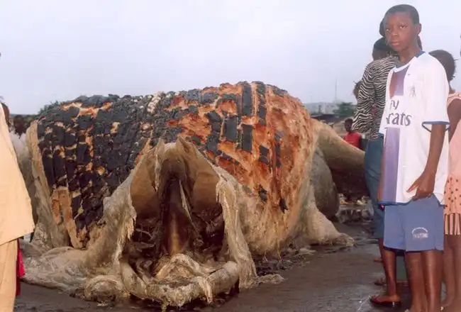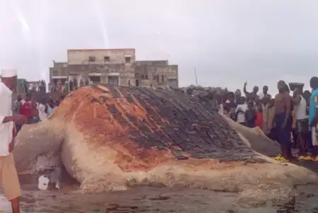 Знакомая привезла из Гвинеи фото, не думайте что монтаж. Сказала учёные прилетали пощупали и улетели. Сказали: "Знаем такое, видели." Зверушку, дохлую, выбросило на берег из атлантики. НА фото она заметно разложившаяся.. Как говорится есть всё "усы, лапы, хвост"... Чешуи нет. А на спине гребень и шерсть... Вид с переди. Лежит на спине. С открытой пастью. видна передняя и задняя "лапы"