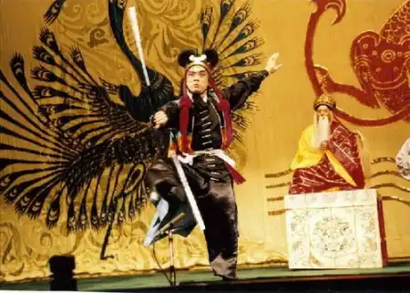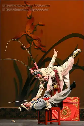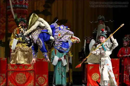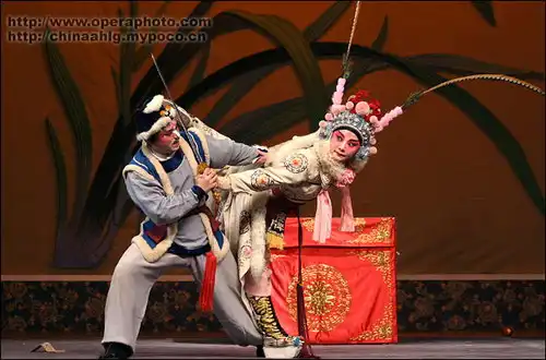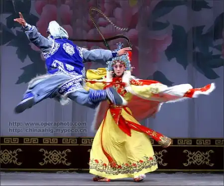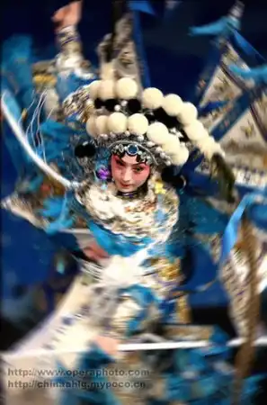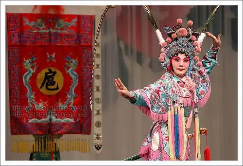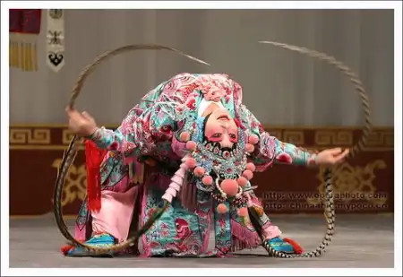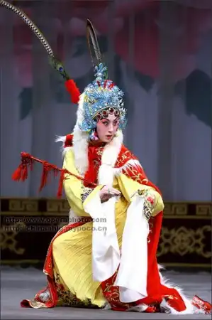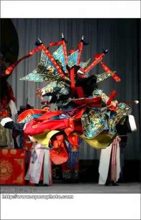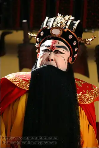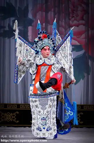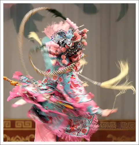 Император носит одежду желтого цвета, принцы - абрикосово-желтого, старые сановники - ярко коричневого или белого, князья - красного цвета. Кроме того, есть манпао синего, фиолетового, зеленого, черного цветов. Цвет одежды зависит не только от общественного положения персонажа, но и от его характера и грима. Честные и справедливые персонажи обычно носят одежду красного и зеленого цвета, грубые или коварные - одежду черного цвета. Например, князь Ба-ван в спектакле "Прощание Ба-вана с наложницей" и чиновник Чжао Гао в спктакле "Меч вселенной" носят манпао черного цвета. В первом случае черный цвет свидетельствует о грубом и открытом характере персонажа, а во втором случае - о его коварстве и лицемерии. Императрицы, принцессы, жены генералов и министров также носят одежду, которая по фасону аналогична мужскому манпао. Но вместо дракона на ней вышивается летящий феникс или орнамент из фениксов, длина женского одеяния несколько короче (чуть пониже коленей), на плечах накидка, внизу из-под манпао виднеется юбка. В первой сцене спектакля "Опьянение Ян Гуй-фэй" я выступаю в манпао красного цвета, а во второй сцене - в дворцовом платье "гунъи".