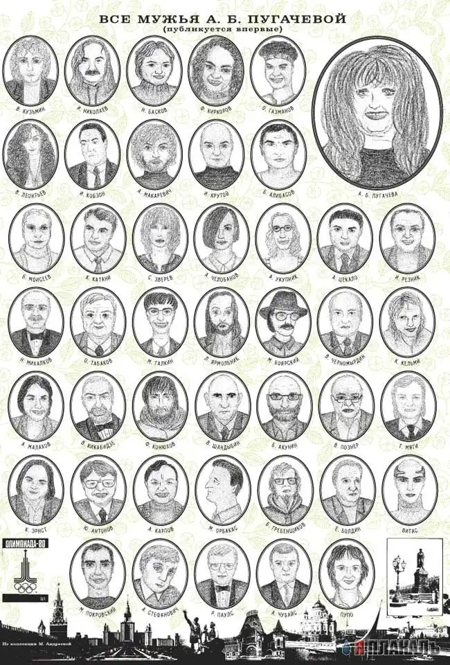 Публикация также способна украсить собой часть стены офиса, укромный уголок на кухне терпеливой хозяйки, внутреннюю сторону двери в научной лаборатории, ведущей дерзкие изыскания, а также что-нибудь еще. ВНИМАНИЕ! К портретной галерее мужей певицы прилагается эксклюзивное изображение самой Аллы Борисовны.