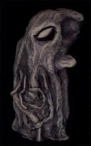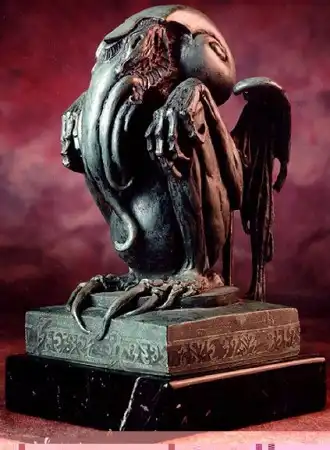 "...она изображала монстра, очертания которого смутно напоминали антропоидные, однако у него была голова осьминога, лицо представляло собой массу щупалец, тело было чешуйчатым, гигантские когти на передних и задних лапах, а сзади - длинные, узкие крылья. Это создание, которое казалось исполненным губительного противоестественного зла, имело тучное и дородное сложение и сидело на корточках на прямоугольной подставке или пьедестале, покрытом неизвестными иероглифами. Кончики крыльев касались заднего края подставки, седалище занимало ее центр, в то время как длинные кривые когти скрюченных задних лап вцепились в передний край подставки и протянулись под ее дно на четверть длины. Голова монстра была наклонена вперед, так, что кончики лицевых щупалец касались верхушек огромных передних когтей, которые обхватывали приподнятые колени."
