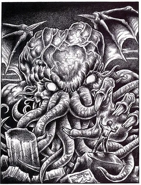 И хотя данная иллюстрация пердставляет собой не просто изображение К'тулху, а сцену из рассказа. Использовалось на обложке книги The Dunwich Horror and Others издания Эркхэм Хаус в 80-х годах.