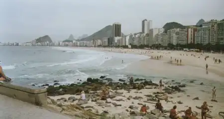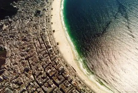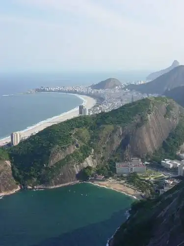 10. Вид на район Копакабана с горы Пан-ди-Асукар. Узкий район длиной 5 км ограничен с одной стороны горой, а с другой - Атлантическим океаном. Здесь находится много ночных увеселительных заведений, элита Рио-де-Жанейро имеет здесь виллы. Туристов же привлекает известный на весь мир пляж.