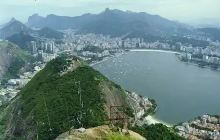 37. Гора Пан-ди-Асукар также является одним из самых известных символов города. Свое название она получила благодаря причудливой форме ("Пан-ди-Асукар" дословно переводится как "Сахарная голова"). На вершине горы, к которой ведут канатные дороги, располагается знаменитая телевизионная станция "Реди Глобу".