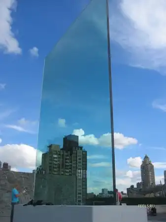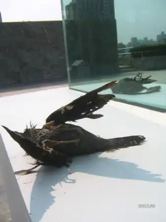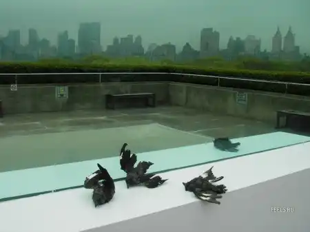 Это памятник птицам, которые разбились о многочисленные стекла чуть менее многочисленных высотных зданий (небоскрёбов), коих в Нью-Йорке превеликое множество. Птица, летящая на высоте нескольких десятков метров, просто не может начать ожидать, что там могут быть препятствия. А уж тем более она не может подумать, что в окне может быть стекло. Да и не успела бы ни за что.