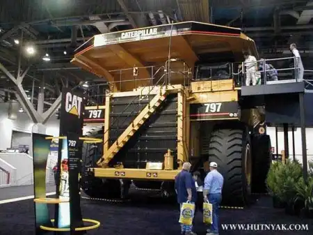 Карьерный самосвал Caterpillar 797B массой 623690 кг может перевозить за один раз до 345 тонн груза.