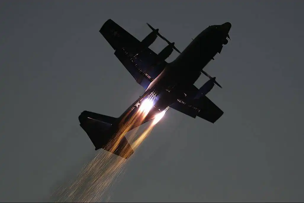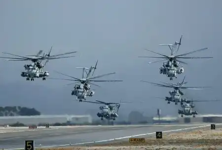 ) - транспортник, видны огни пороховых ускорителей, для взлета с короткого разбега 5 - "Хариер" - Самолет ВПП, 6 - F-18, 7 и 8 - "Оспри" - транспортник с поворотным двигателем, 9 и 10 - "Блэк Хоук" - многоцелевой вертолет 11 - "Пума"