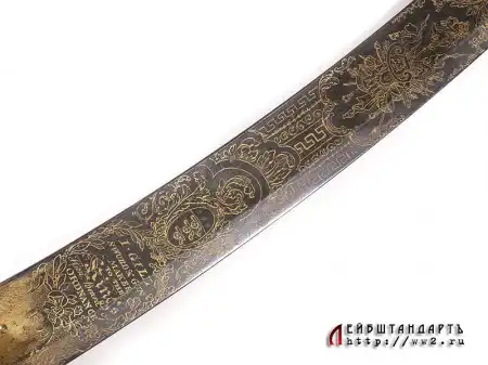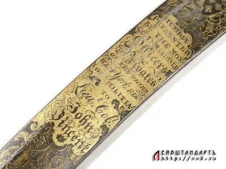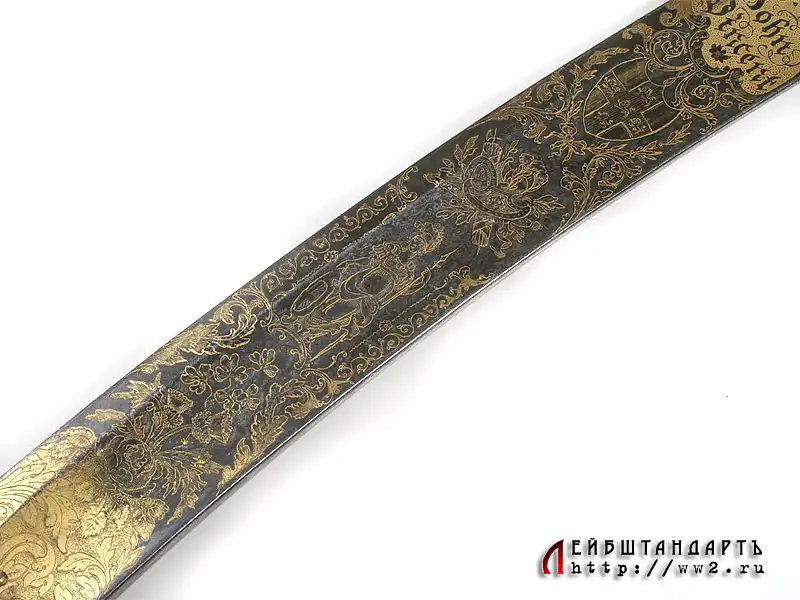 Клинок значительной кривизны, с одним широким долом, абсолютно по всей длине украшен травлением: нанесен декоративный растительный орнамент в стиле «ампир», изображены четыре геральдических щита, аллегорические сцены из античных мифов, военная арматура, девизы и дарственная надпись в медальоне: “Humbly presented by the non-commissioned Officers & Privates of the third West-York regt. of militia to Lieut.Coll.John Vincent”(покорнейше поднесена унтерофицерами и рядовыми третьего западно-Йоркского полка легкой пехоты подполковнику Джону Винсенту). На другой стороне клинка помещен медальон, также нанесенный травлением, с клеймом оружейного мастера: “I.Gill sword & gun maker to the King’s Honble Board of Ordinance”. На обухе клинка надпись: “Warranted”(Гарантировано). Клинок полностью вызолочен, сохранилось значительное количество оригинальной позолоты.