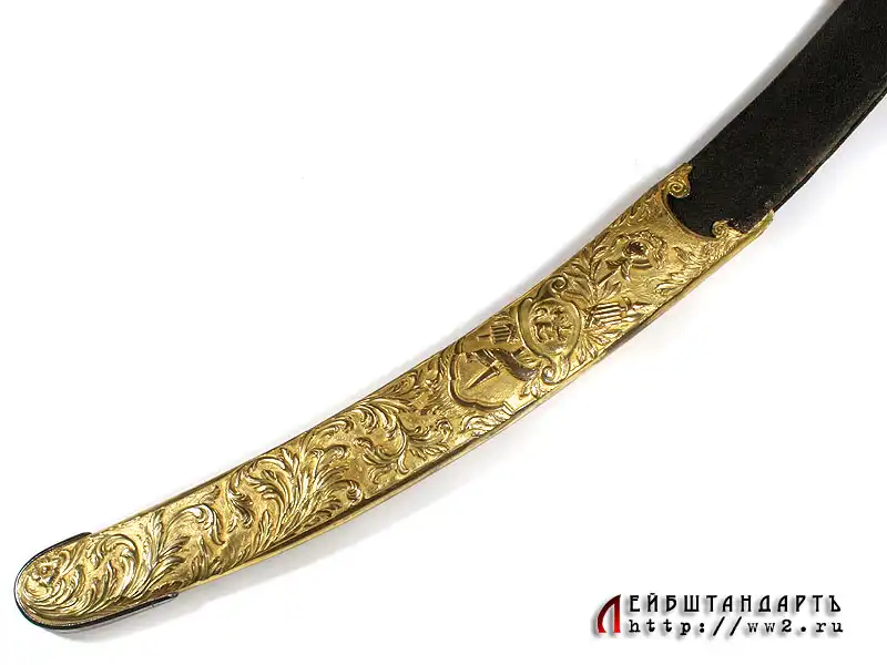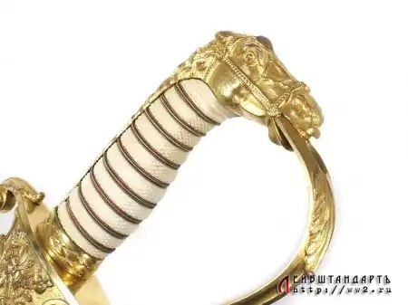 Эфес состоит из рукояти и бронзовой гарды. Рукоять из высококачественной слоновой кости с насечкой, обмотана по поперечным желобкам витой проволокой разных диаметров. Гарда образована спинкой и передней дужкой, отходящей от верхней части рукояти и плавно переходящей в крестовину, конец которой слегка загнут вниз и закруглен. Навершие трактовано в виде лошадиной головы, рельефно проработанная грива украшает собой спинку рукояти. Дужка снабжена закрывающим основание клинка декоративным щитком, украшенным в стиле «ампир» рельефными изображениями военной арматуры. Все бронзовые части эфеса покрыты оригинальным «огненным» золочением, сохранившимся практически полностью.