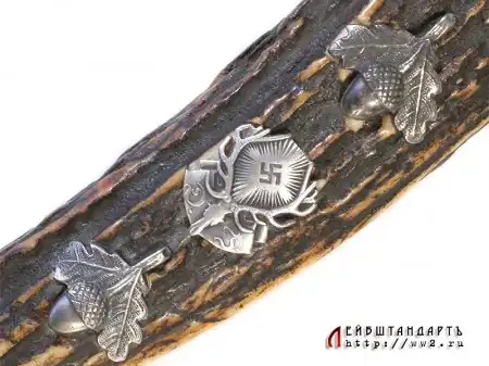 Парадный кинжал лесничего в превосходном заказном исполнении. Клинок дамасской стали с "глазчатым" рисунком, без долов, украшен тщательно прорисованным травленым орнаментом и изображениями сцен охоты. Рисунок частично вызолочен, золочение отлично сохранилось. Без клейм. Чашка и гарда рукояти посеребренные, гарда трактована в виде оленьих копыт, на щечках рукояти из оленьего рога накладные посеребренные желуди и эмблема Германского охотничьего союза. Чашка гарды украшена рельефным изображением свастики в венке из дубовых листьев. Все металлические элементы рукояти тщательно проработаны. Ножны черные кожаные, устье и наконечник ножен также посеребрены. Серебрение покрылось легким налетом красивой темной патины. Очень красивый коллекционный предмет в редком заказном исполнении и отличной сохранности.