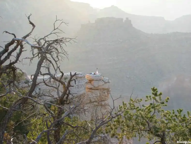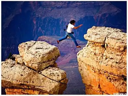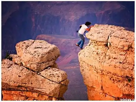 История: Фотограф-идиот перепрыгивает с одной скалы на другую в Великом Каньоне только для того, чтобы сфотографировать закат. Глубина каньона 900 метров. Ну не идиот ли?