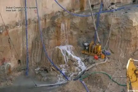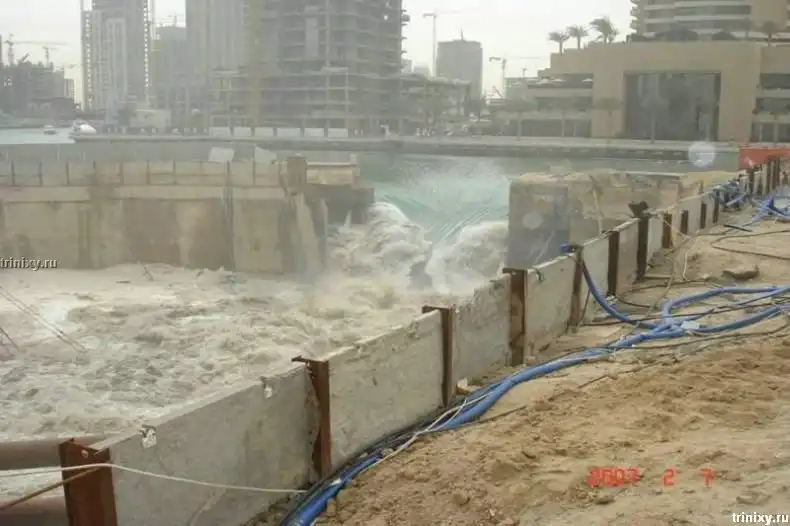 История:Во время строительства 80-этажного дома в Дубаи, вода из залива прорвала стену и затопила площадку.