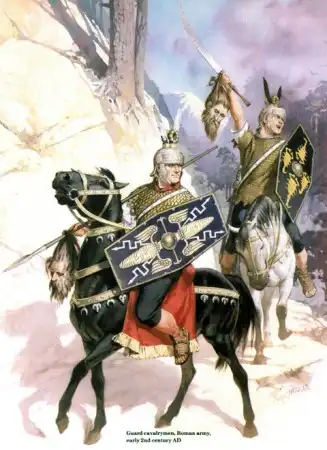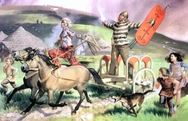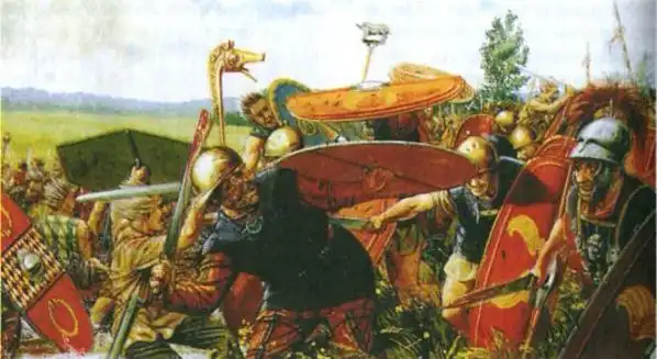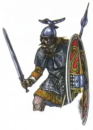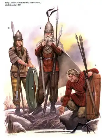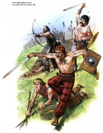 Судя по одежде это галлы, кое-где, возможно, германцы, разных периодов, времён Римской Империи. На четвёртой снизу римские кавалеристы. Жаль подписи почти не видно, можно было бы уточнить.