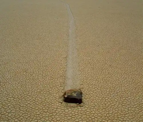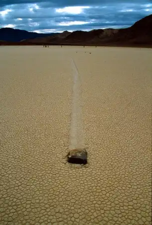 Бред... что тут такого? Земля вибрирует с частотой как у молитвы , камни резонируют и получается эффект фиброзвонка на телефоне (звонок - и телефон поехал борозжить просторы стола) , соленая глина создает эффект масллянистого гладкого стола и вуаля камень тож начинает борохдить большой театр ...