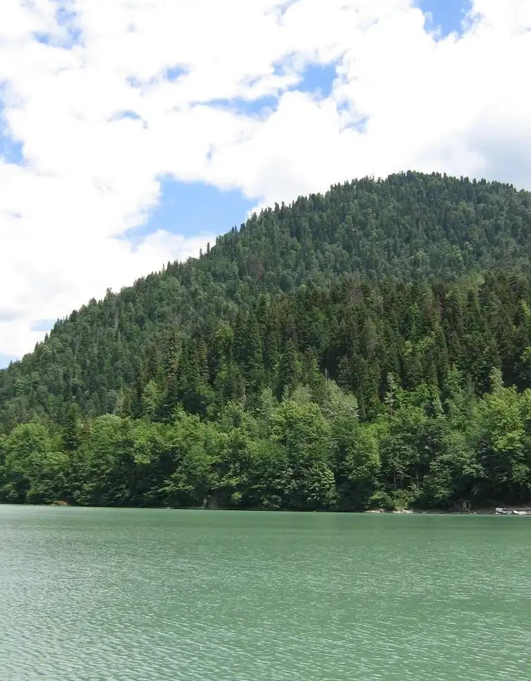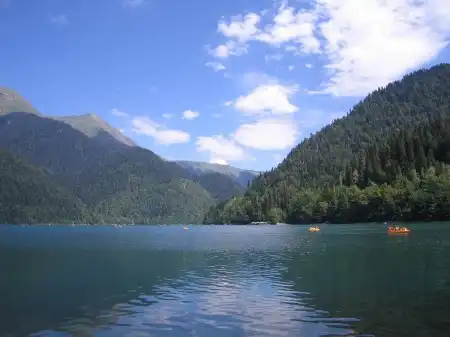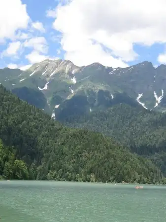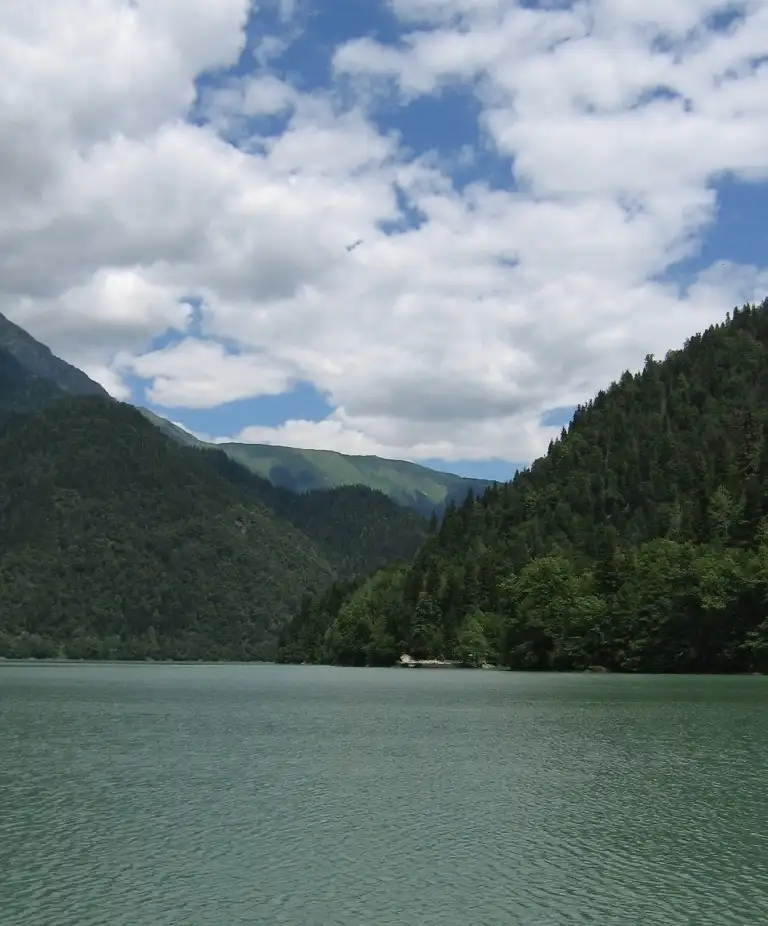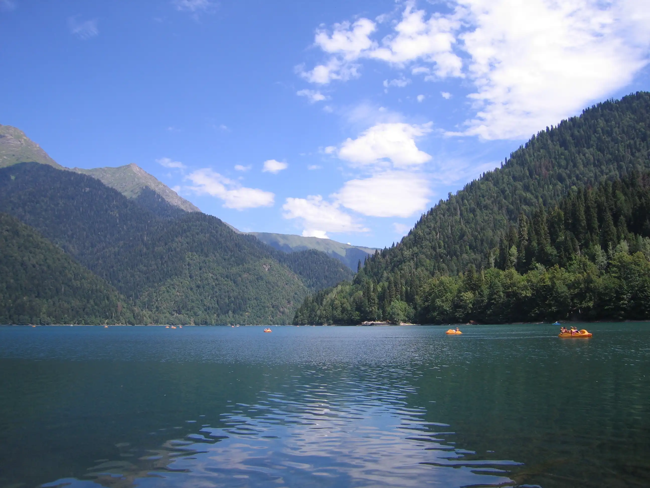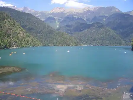 В синих горах Кавказа, где сверкают белоснежные ледовые вершины гор, на высоте 950 метров над уровнем моря переливается на солце изумрудом озеро. Рица- жемчужина Кавказа.