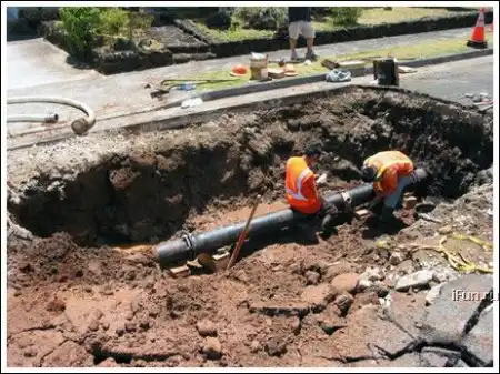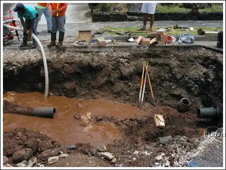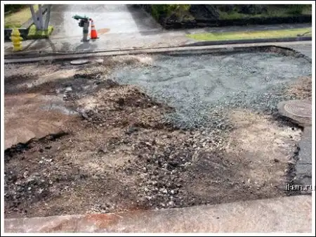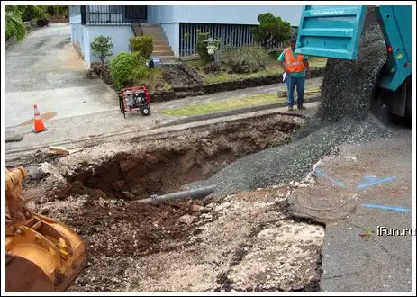 Из трубы начала протекать вода. Размыло почву, асфальт провалился. Потом заделали но хреново - трубу опять прорвало и пошёл фонтан. Я так понял.