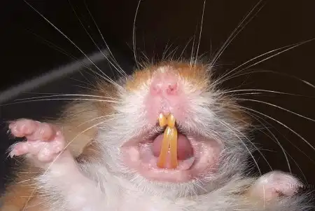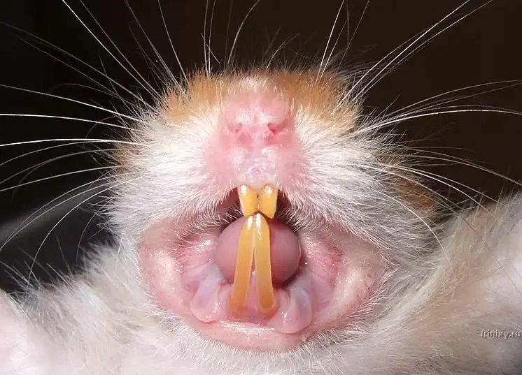 а что вы хотели?? это грызун, блин. у него зубы растут всю жизнь, поэтому их необходимо стачивать. а вообще они кусаются крайне редко.У них это четыре клыка, а там дальше ближе к горлу еще около 20 зубов есть