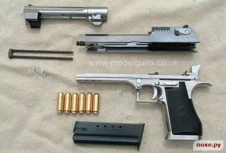 История пистолета Desert Eagle начинается в конце 1970х годов, когда группа американцев организовала небольшую компанию Magnum Research с целью разработки, выпуска и продажи спортивно-охотничьего самозарядного пистолета под мощный патрон .357 Магнум (при стрельбе из 150мм ствола он по дульной энергии может превосходить патрон 9х19 Парабеллум до двух раз). В 1980 году были получены первые патенты на конструкцию пистолета с газоотводной автоматикой, в 1981 году появился первый прототип, по скромному описанию самих разработчиков "функциональный на 80%". Для доводки и дальнейшего серийного пистолета, получившего обозначение Eagle 357, была избрана израильская оружейная компания IMI (Israel Military Industries). В 1982 году появилась первая реклама нового пистолета, а чуть позже появились и первые серийные образцы. Примерно к 1985 году пистолет получил его современное обозначение Desert Eagle (Орел Пустыни или Пустынный Орел - кому как больше нравится), тогда же несколько изменилась его конфигурация и ствол приобрел полигональные нарезы вместо обычных. В 1986 году появился вариант Desert Eagle под еще более мощный патрон .44 Магнум - первый самозарядный пистолет под этот револьверный патрон.