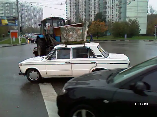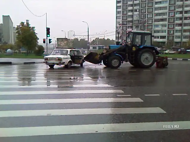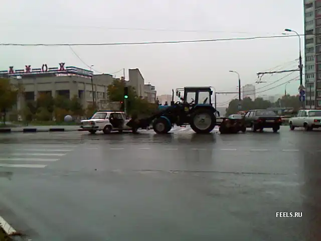 Трактору повезло. Если б жигулёнок встретил его мордой, то у трактора всю загребалку помял бы и в кабину запихал.