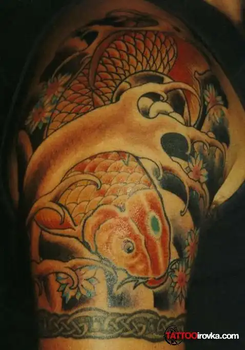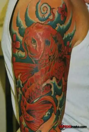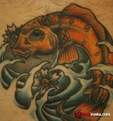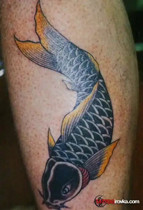 На тату в стиле Иредзуми, изображен карп. В японском эпосе он символизирует собой упорство