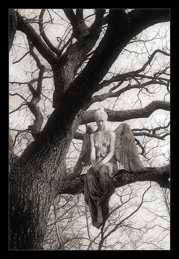 Ангел на дерево, по-моему, фотошоп, т.к. он же на 8ой снизу, да и деревья растут и на них статуй не делают. Но все равно красиво.