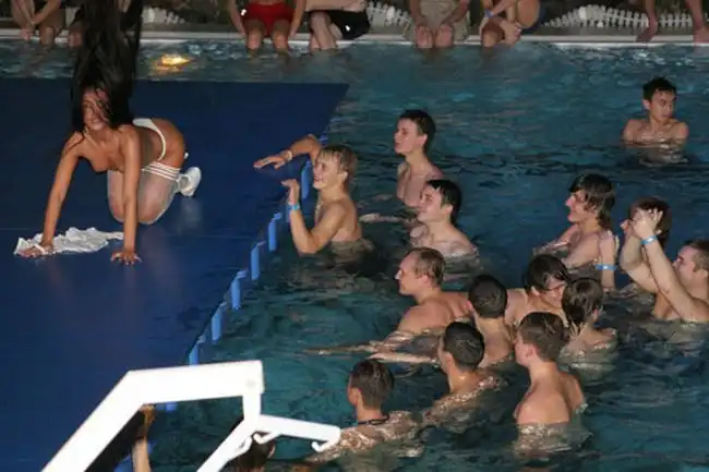Школьники-подростки пришли в городской аквапарк поболеть за участниц конкурса красоты на воде «Мисс Аква». 36 участниц в возрасте от 14 до 23 лет дефилировали по надувному подиуму в оригинальных костюмах и купальниках, как вдруг ведущий объявил: «Детей просим удалиться в игровую комнату». Зрители на секунду замерли. На балконе семейная пара поспешила увести шестилетнего ребенка. «А теперь стриптиз!» - продолжил ведущий. И на надувной плот вышла танцовщица.