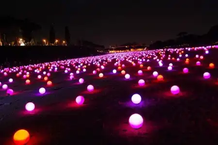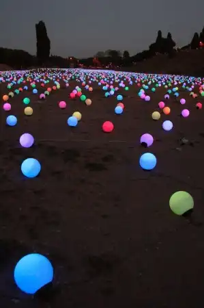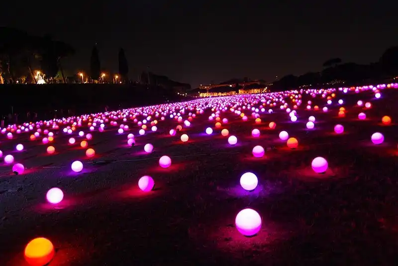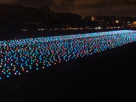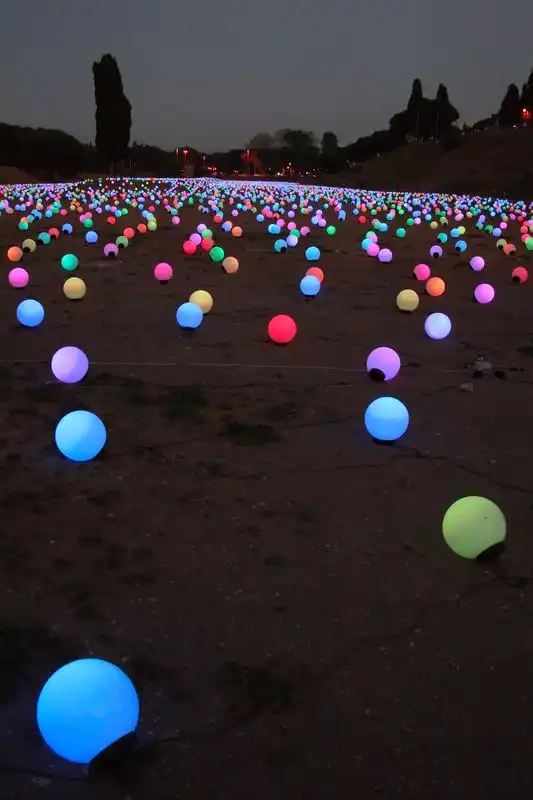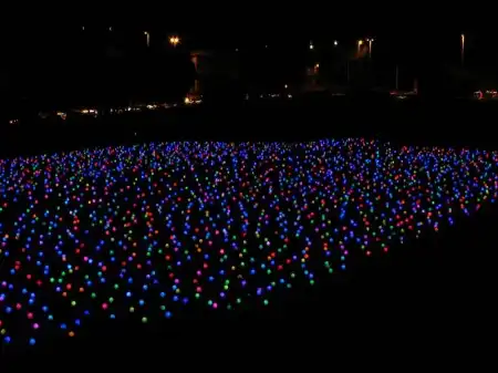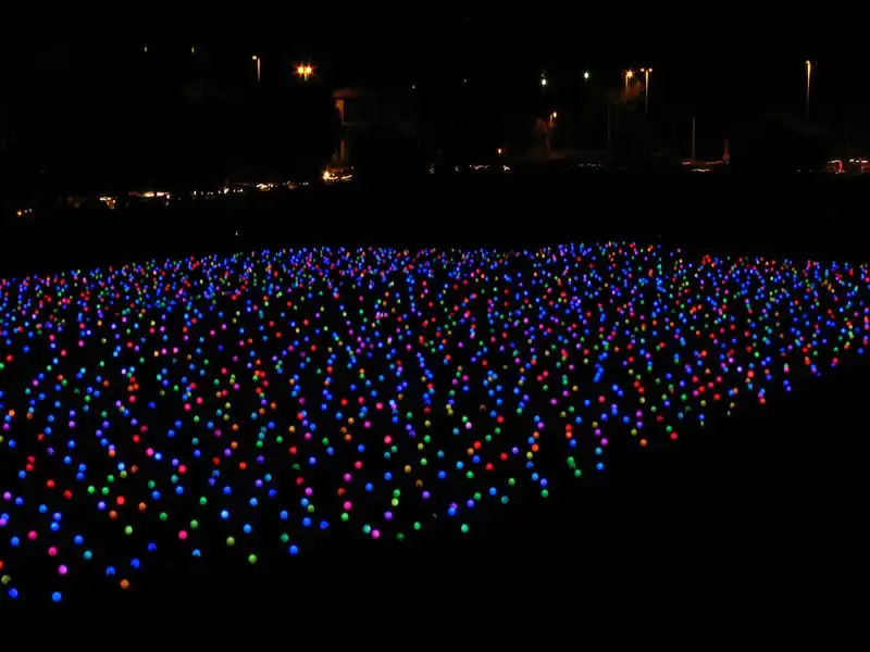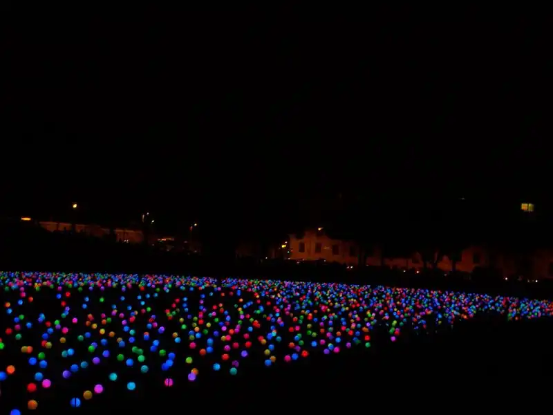 Поле усеяно большим количеством круглых лампочек, соединённых между собой проводами. Ночью лампочки горят, ярко-ярко и ежеминутно меняют свой цвет. В результате создают необычайную картину на которой длинное поле усеянное большими яблоками светящимися яркими цветами. Поле длинной в пятьсот метров упирается в театральный собор, где обычно собираются большое количество туристов. Поле охраняется невысоким забором с предупредительной запиской, в которой чётко обозначено, что хождение по полю опасно для жизни. Но правила бессильны, когда речь идёт о сказке, говорит дежурный полицейский, который сам неоднократно выводил детишек поддавшихся красивому зову фонарей. Были случаи когда на поле въезжали легковые автомобили, но с появлением на прилежащей трассе заградительного забора, такие случаи, окончательно прекратились.