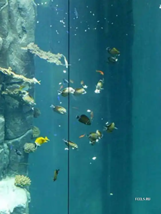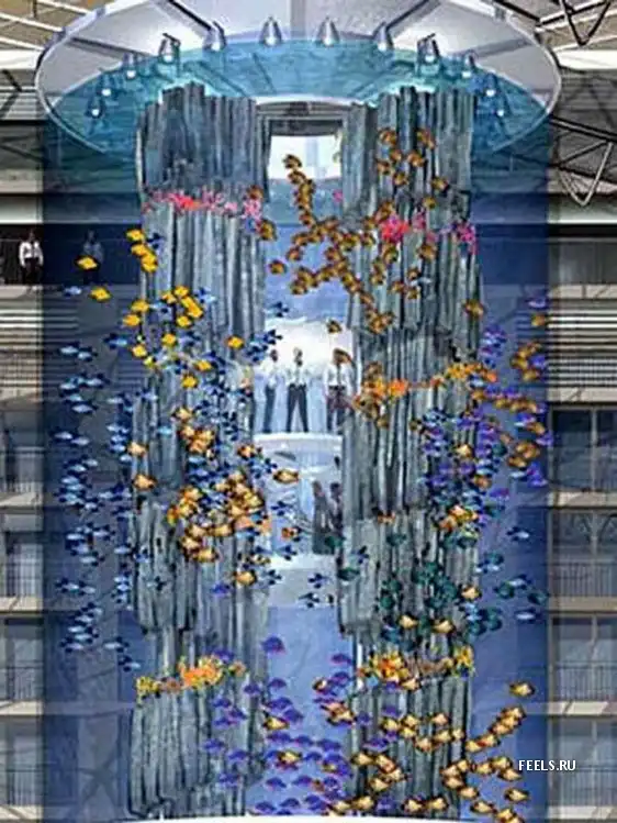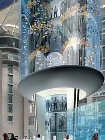 Этот удивительный аквариум расположен в 5-ти звездном отеле Radisson SAS Hotel в Берлине. Это самый большой цилиндрический аквариум в мире, внутри плавает 2500 тропических рыб. Высота 25 метров, 11,5 метров - диаметр.