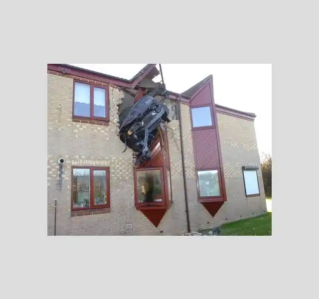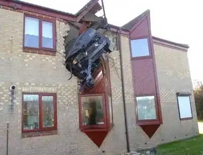В британском городе Петербург (Peterborough) водитель на автомобиле Volvo, пролетев на машине по воздуху около 30 метров, пробил стену квартиры на втором этаже жилого дома.