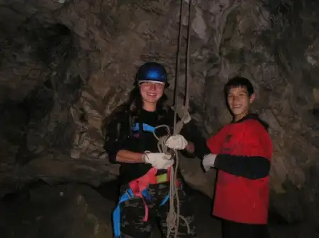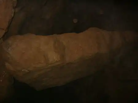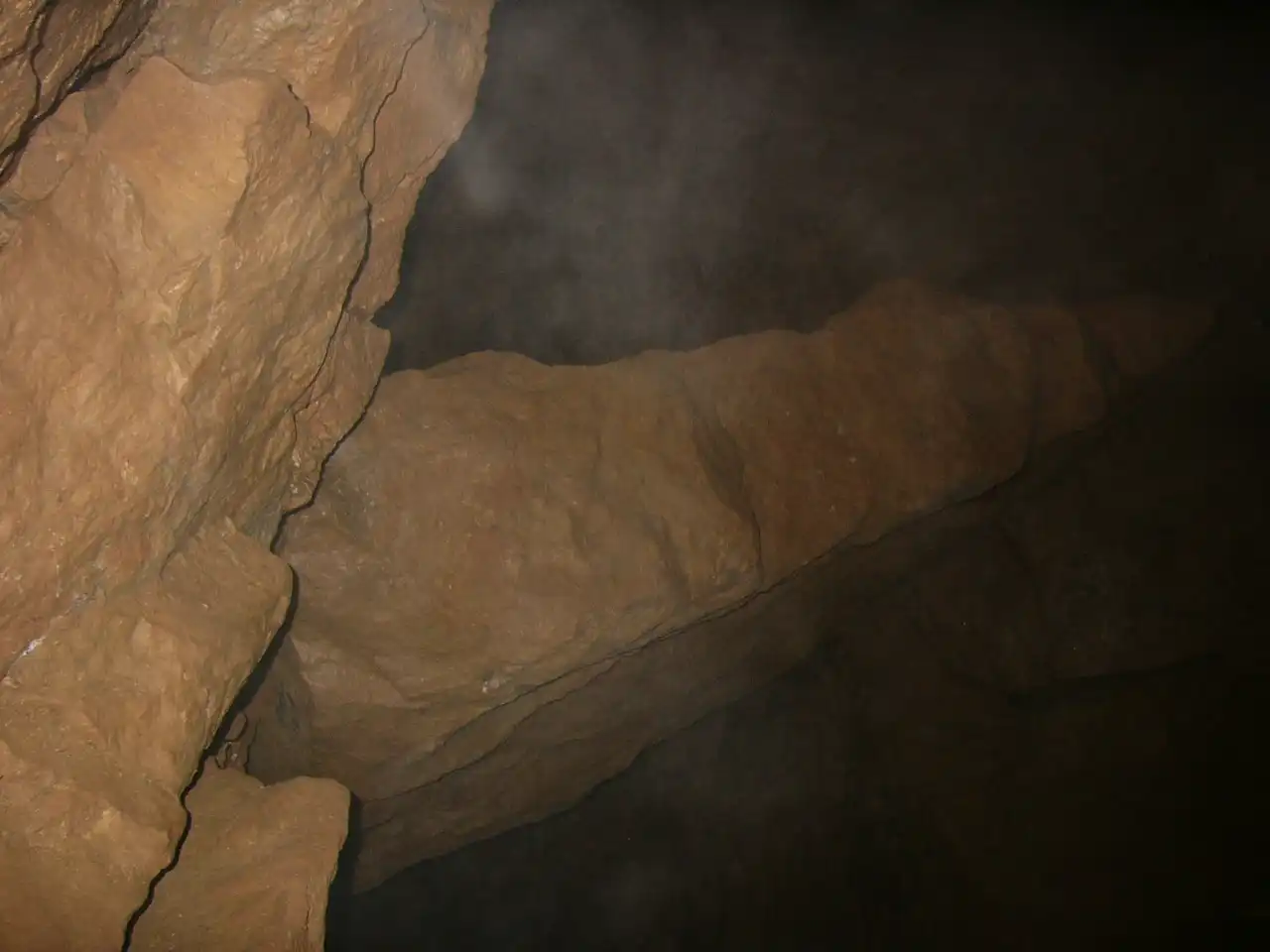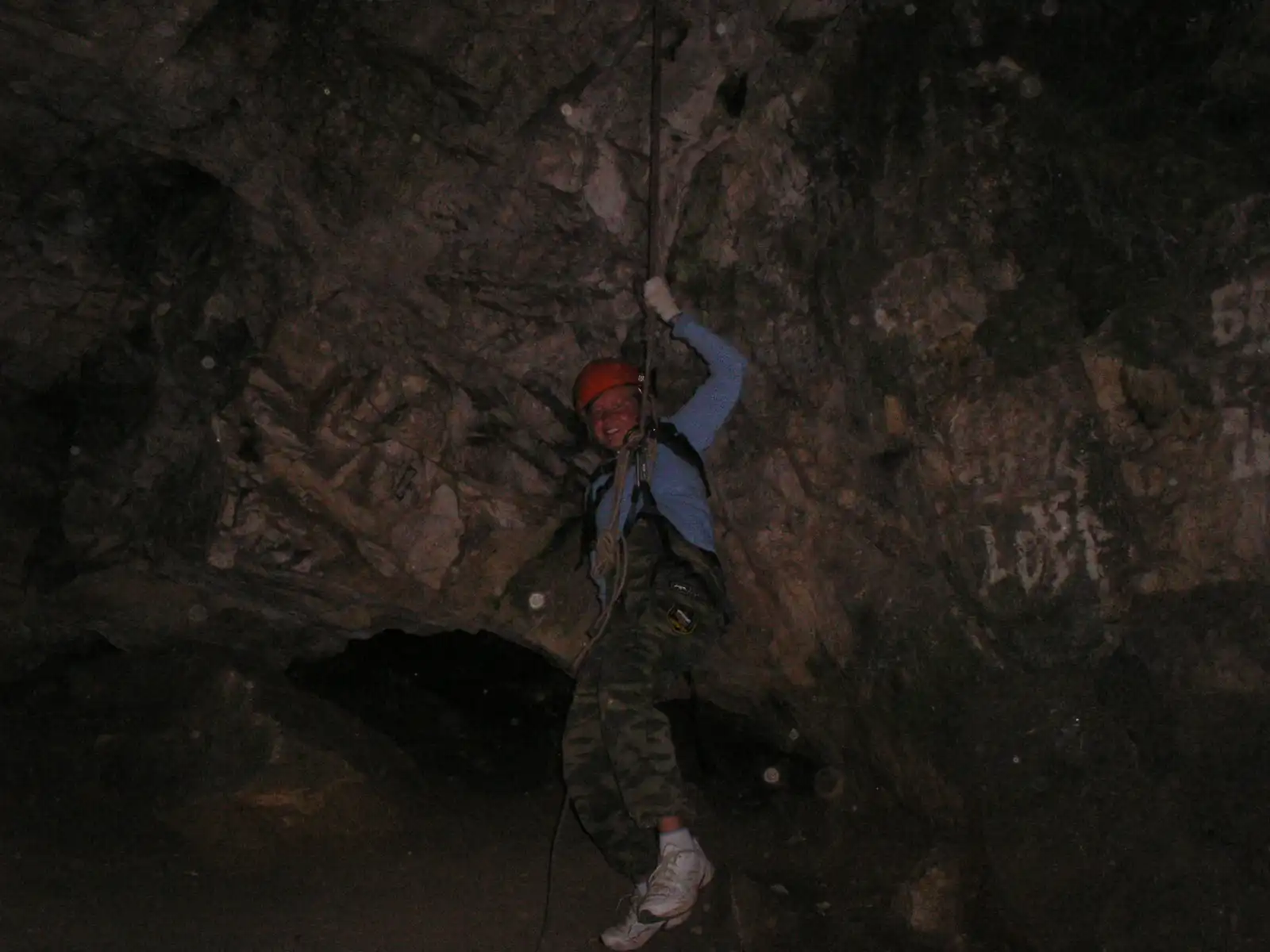 Грот «Дельтаплан». Ну и юмор у спелеологов.. судя по размерам этого «камушка» над головой тон 10 в нем точно есть..