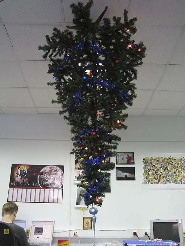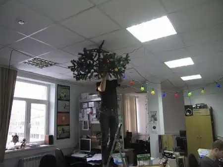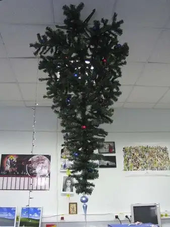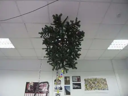 В предверии Нового года во многих офисах возникает проблема с тем, чтобы оригинально украсить офис. Решение есть, надо только приложить немного усилий. Оригинальность идеи с елкой на потолке в том, что не только елка висит вверх тормашками, но и игрушки. А кроме того и подарки "лежат" там, где и положено - под елочкой!!!