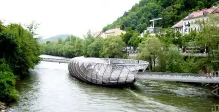 Грац (Австрия). Одно из главных городских сооружений - мост-остров на реке Мур. Очень красивое сооружение. На «острове» располагаются бар, кафейня и даже площадка для желающих позагорать. Ночью же все это очень красиво подсвечивается и создает неповторимую атмосферу.