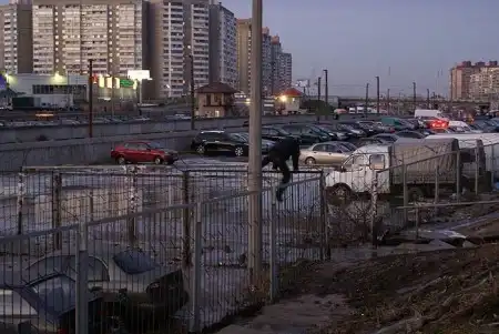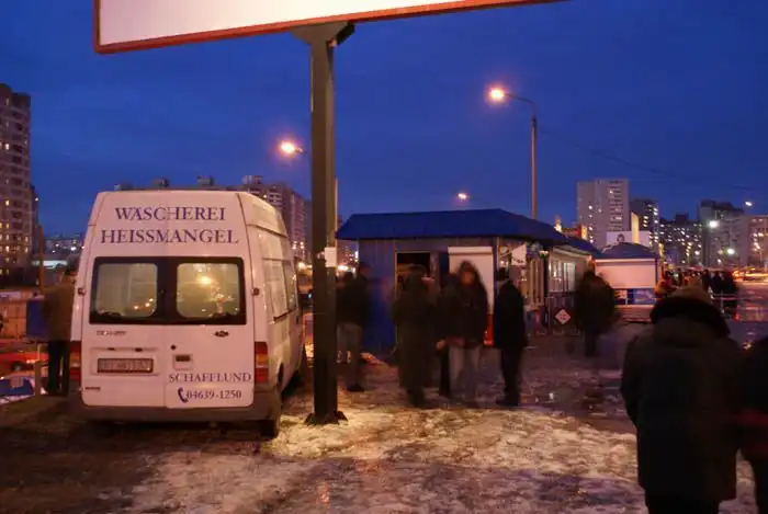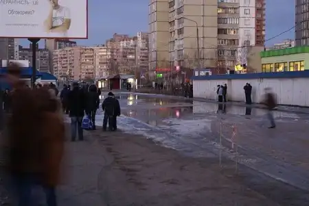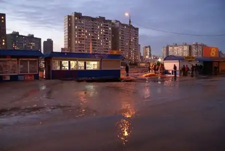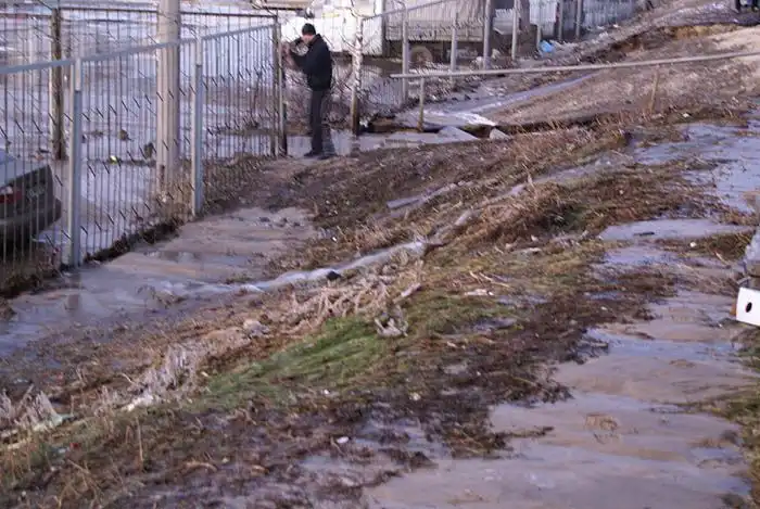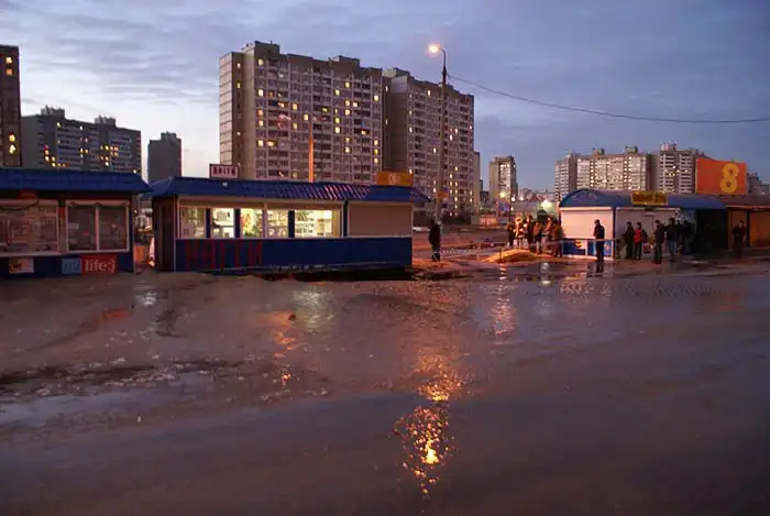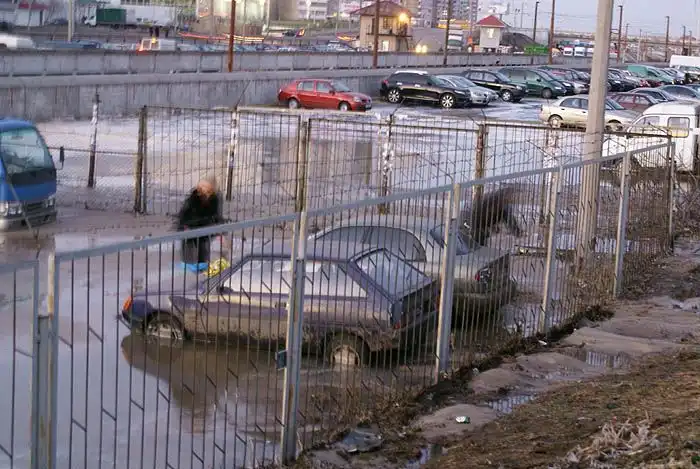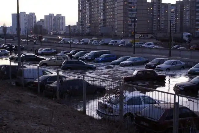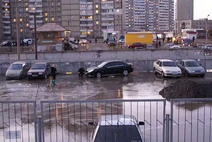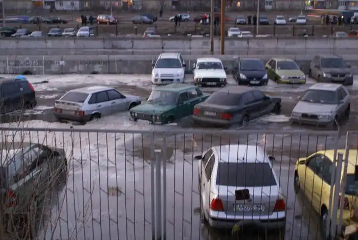 Что-то прорвало. Вода стоит на стоянке в огромном количестве и в нее спускаются с горки небольшие ручейки с песком, постепенно закапывая машинки, лишает их возможности вырваться из этого плена. Люди вынуждены в мороз выкапывать своих ласточек, а некоторые даже через забор перепрыгивают, спеша на помощь к своему верному товарищу. ГАИ перекрыло движение и создалась пробка во дворах. Владельцы киосков поспешно эвакуируют товар, киоски стоят на кроях пропасти…