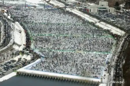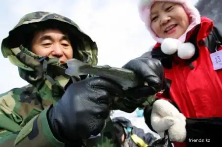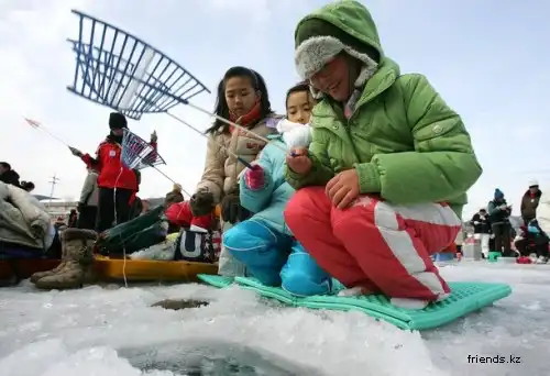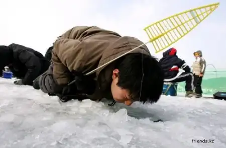 Вчера на реке Букханган в южнокорейском уезде Хвачхон состоялась очередная ежегодная подледная рыбалка, участников ледового фестиваля «Sancheoneo». Ежегодно в середине января сюда приезжает более миллиона человек, чтобы принять участие в этом грандиозном событии – подледной ловле горной форели. Трехнедельный фестиваль не ограничивается одной только рыбалкой, он также включает в себя соревнования по гонкам на санках, лепку ледяных фигур, футбол на льду и другие семейные развлечения, включая большой фейерверк во время закрытия. Но главным событием, безусловно, является выход на лед десятков тысяч людей с удочками и сачками.