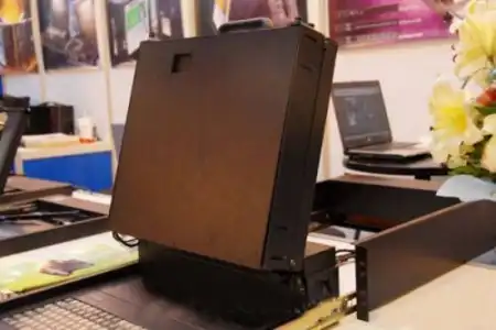 ыыыыыы енто не ноут вы че!!! это для серверов специальный комп в шкафу ставить) и когда серв настраивать тогды он от туда трансформируеться там же видно салазки для стойки!