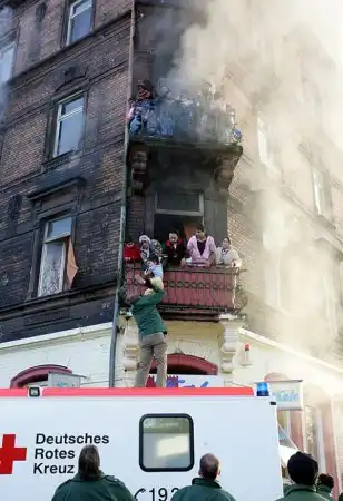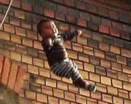 В кадре один из спасенных сегодня родителями во время пожара ребенок – его выбросили с третьего этажа на спасательный брезентовый круг, растянутый пожарными, стоящими на земле. Этому малышу и еще одному повезло – они спаслись. Девять человек (среди них пять детей) погибли в огне пожара, который начался вчера вечером в старом кирпичном доме, где жили около 50 человек.