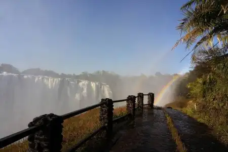 Водопад Виктория - На реке Замбези, на границе Замбии и Зимбабве, находится четвертый в мире по ширине потока и один из крупнейших по расходу воды и мощности водопад - Виктория. Его высота-110 м, ширина-1700м, расход воды-от 1,4 тыс. до 14 тыс. куб. м/c. Река Замбези превращается в пенный и ревущий, срывающийся с отвесных скал каскад воды одного из великолепнейших водопадов. Величавая Замбези, вобрав в себя воды с площади огромного бассейна в 1,3 млн. кв. км, подходит к базальтовой щели и сваливается в бездну с потрясающим гулом.