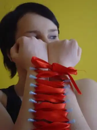 Необычная жесть,хотя в последенее время пирсинг на голове,на пузе,на спине,чуть ли не на заднице,-привычное дело!А если так ленточкой случайно за что-нибудь зацепиться,а потом еще и резко дернуться...Бррр...