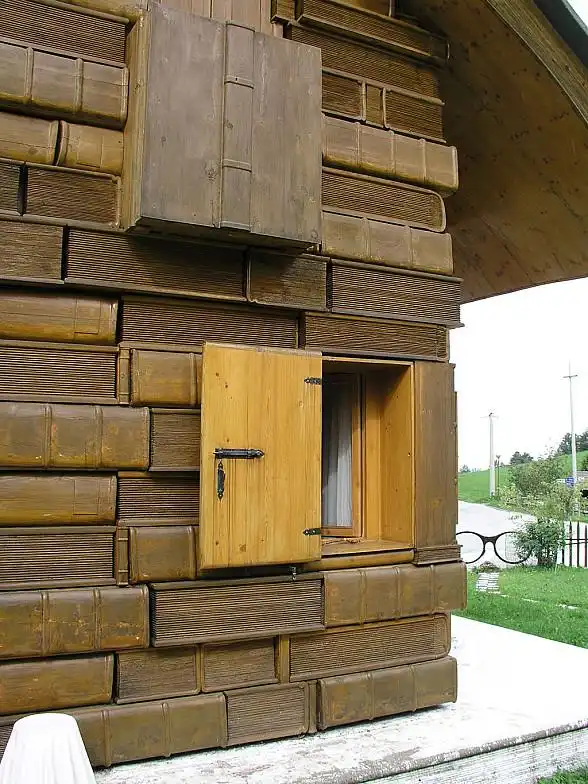 Так же одной из его чудо-работ считается "Дом книг". Он стоит на цементном фундаменте, имеющем форму книги, который – вместе с трубой – являются единственными частями дома, не вырезанными из дерева. С огромной перьевой ручкой вместо трубы, карандашами, служащими оградой и каменными точилками, служащими дорожкой в саду, дом сразу стал местной достопримечательностью. Одно из самых сильных ощущений от дома – прекрасный запах свежего дерева. Книжная тема прослеживается во всей обстановке. При ближайшем рассмотрении стол оказывается большой деревянной книгой, лежащей на полураскрытой книге. Даже обеденные кресла – это хитроумная комбинация из гигантских томов.