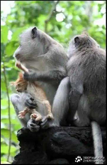 А может не только люди произошли от обезьян, но и кошки. Вот обезьянки и решили вернуть котика в лоно семьи.