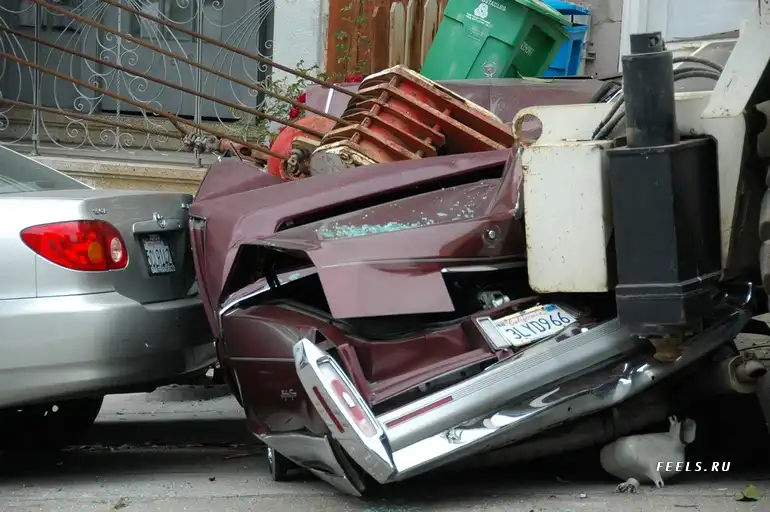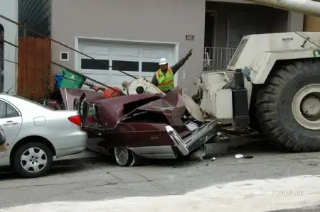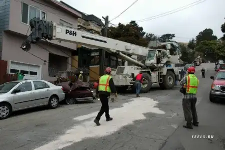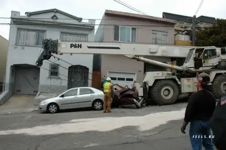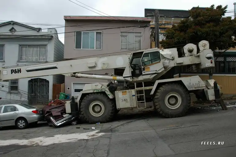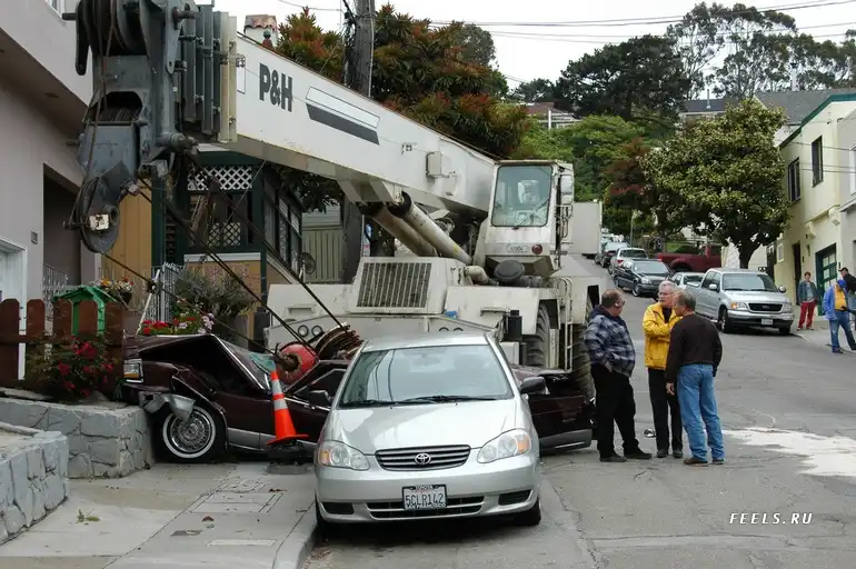Это кадры из national geografic, из сюжета как они дома перевозили. Там тормоза у крана отказали, он поехал по наклонной. Таков итог торможения в конце улицы.
