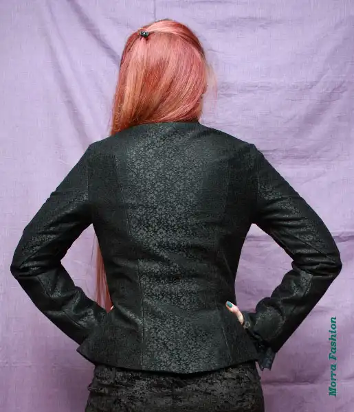Жакет из костюмной ткани с вытканным рисунком на бордовой подкладке.
