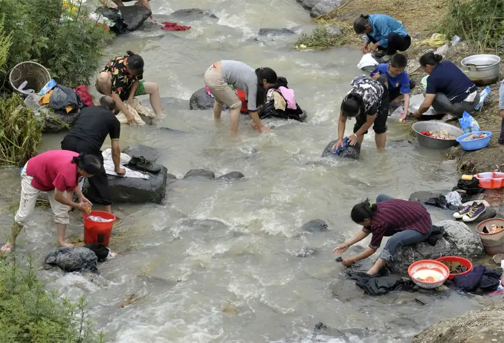 Оставшиеся в живых после землетрясения стирают одежду в реке в городе Leigu провинции Beichuan, в юго-западной области Китая Сычуани 31 мая 2008.