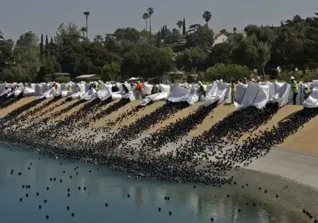 Департамент по управлению водными и энергетическими ресурсами выпускают более 400 тысяч черных шариков, для защиты воды в этом бассейне от канцерогенов, которые вырабатывает солнечный свет.