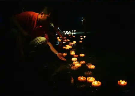 Люди пускают свечи по реке накануне фестиваля Duanwu в память о жертвах землетрясения в Китае.