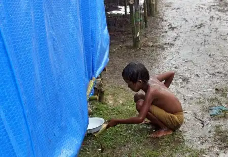 Ребенок собирает дождевую воду, стекающую с палатки в лагере для людей, эвакуированых из-за циклона Nargis около города Labutta 31 мая 2008. Спустя месяц после того, как циклон Мьянмара оставил после себя 133 000 человек мертвыми и пропавшими без вести.