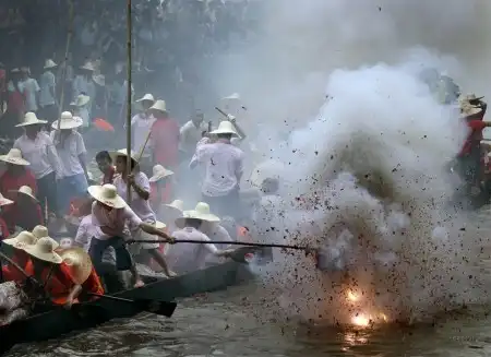 Деревенские жители пускают фейерверки на реке в честь праздника Лодок Драконов в южном Китае.
