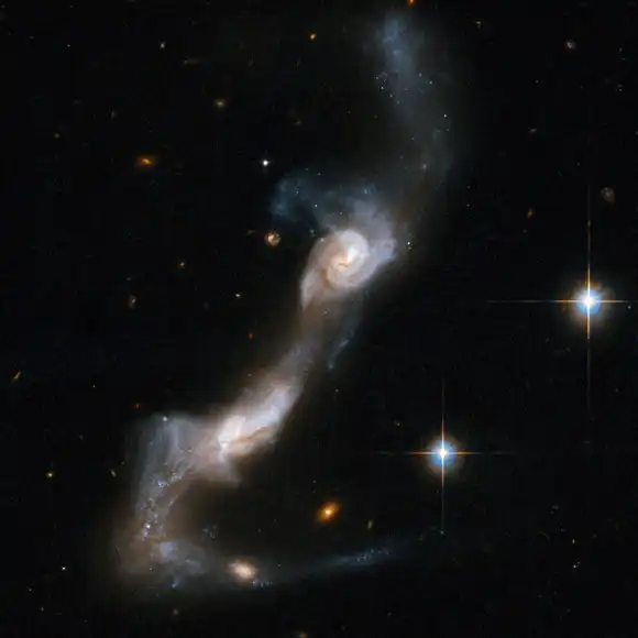 This is a system of merging galaxies with a bizarre shape. Young starburst regions hang between the main galaxy cores. Zw II 96 is located in the constellation of Delphinus, the Dolphin, about 500 million light-years away from Earth.
